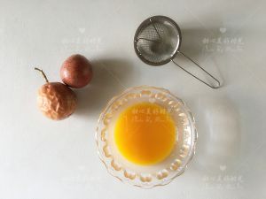 百香果对半切开倒在网筛中,用勺子碾压去籽,过滤出汁水