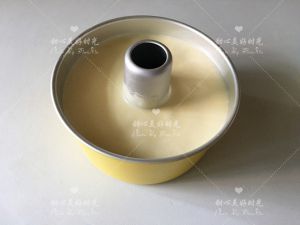 将做好的面糊倒入模具中,并在桌上轻磕震出气泡