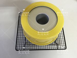 烤好的戚风从高约30cm左右扔下,震出热气;找个瓶子倒扣(没有就只能扣网架了),放凉后脱模