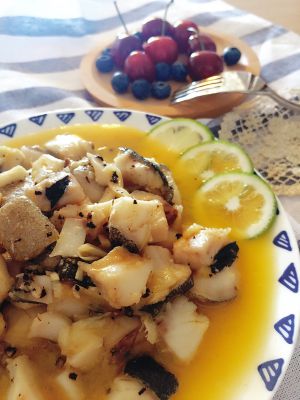 很多菜谱里鳕鱼都是整块先腌后煎(呃,你好污)但这块鳕鱼长得不美,而且整块煎总感觉不能很好入味,所以我把它切成1.5公分左右的小方粒。不用腌制,深海鱼本身足够鲜美,腥味不会很重。