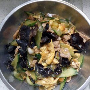 先把鸡蛋炒熟盛出,热锅放油,爆香葱蒜,放五花肉炒的有点变色放一点生抽,在放黄瓜,木耳,翻炒至黄瓜有点变色,放入鸡蛋翻炒。