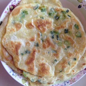 锅里不放油,把面坯放入后,在朝上的一面倒一点点油,用铲子抹平,然后翻面,在另一面上再倒油,摊饼直到出葱香即可