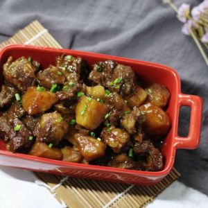 筷子比较容易可以插入肉块时,放入炒过的土豆,继续煮至土豆软糯。