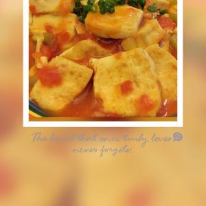 煎好豆腐捞起备用。番茄、青椒切丁,蒜切片,到油入锅,青椒、蒜片倒入翻炒,再倒入番茄,放少许盐,加入少许混水淀粉,翻炒至粘稠的汤汁。