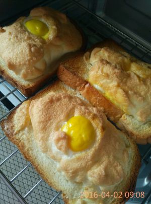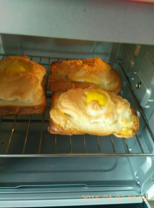 想做几个就需要几个鸡蛋,蛋清蛋黄分离,蛋清加糖打发至硬性发泡阶段抹到土司上面中间放蛋黄。