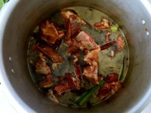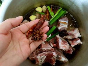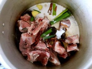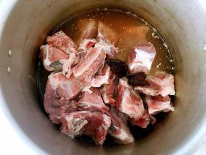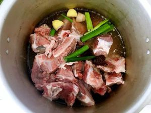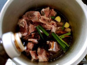 首先将大块猪骨头略洗,置大盆中加满清水浸泡约6~12小时,中间换水数次;然后将泡净血水的脊骨冲洗数遍后置高压锅中加啤酒和料酒没过猪骨;再放入两大勺干黄酱。
