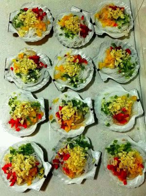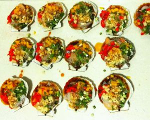 将彩椒,蒜沫,和香葱码在粉丝上面。