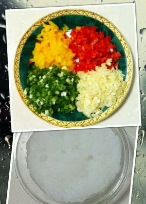彩椒,蒜,葱切沫,粉丝煮好,用凉水焯一下备用。