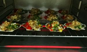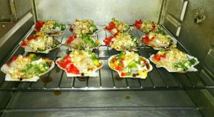 将扇贝整齐的摆放进烤箱,靠近下火。