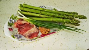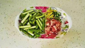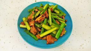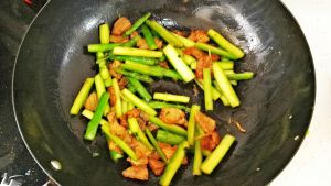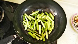 二、 瘦肉切片将瘦肉用生抽、淀粉、姜丝腌制5分钟,以入味。芦笋切片。
