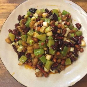 锅里烧油下入干辣椒节和花椒炒香接着下入葱姜蒜片爆香放入鸡丁翻炒均匀后,转大火将兑好的汁水倒入锅中 翻炒均匀后倒入花生米炒匀即可起锅装盘!