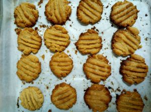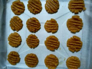 将面团揉成小汤圆大小的小团,间隔摆在事先铺好油纸的烤盘上,同时可170度预热烤箱。再用餐叉在小圆团上压一下,压出花纹