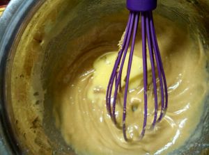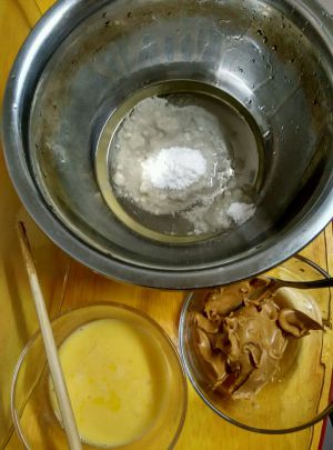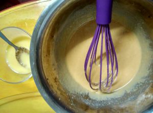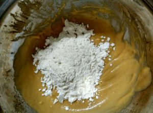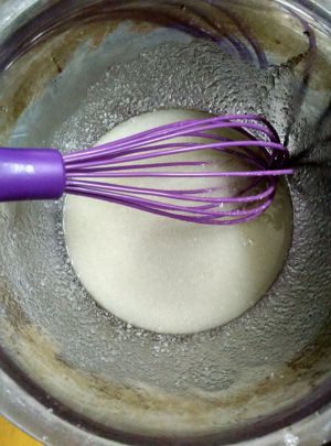 待蛋液全部加完并搅打至完全融合,此时加入低筋粉和泡打粉