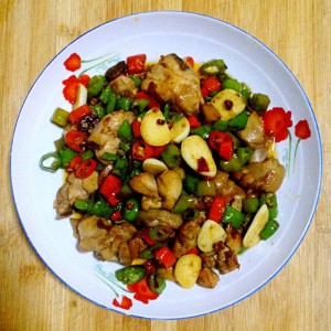 热油下鸡肉,白酒到入,用火点燃翻炒片刻,放入香辣酱,花椒,大蒜翻炒,差不多3分钟后放入辣椒翻炒2分钟,放入盐调味
