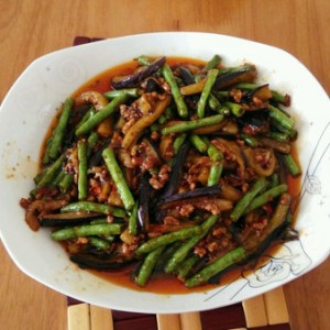 油烧到四成热,分别放入豆角和茄子,炸软即可捞起备用