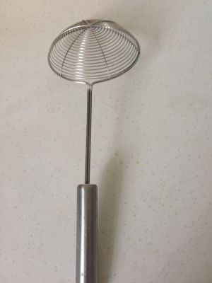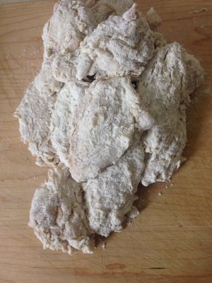 3、用工具一,分批将裹上粉的鸡翅、翅根稍稍浸一下水,然后用工具一上下颠一颠,使鸡翅、翅根上残留的面粉成凝固状(粘粘的)。