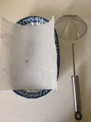 准备好盘子和吸油纸,将其捞出,控油,摆盘!大功告成!