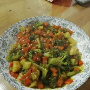 热锅倒油,等油有点点冒烟了开始把西蓝花胡萝卜土豆倒入锅内翻炒1--3分钟左右