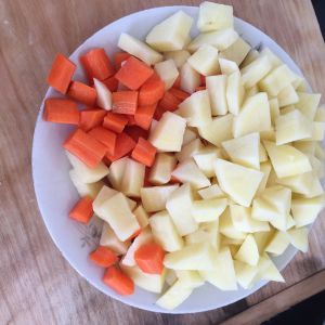 先放油炒鸡胸,变白,先收入碟,照放油炒洋葱,出香味,放入胡萝卜和土豆,待土豆变金黄色,放入鸡胸在翻炒一小下,