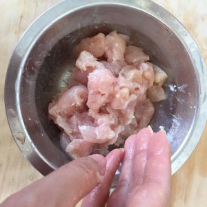 切块,加入淀粉,少盐,料酒,抓匀腌制十分钟