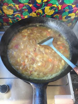 倒入盖过食材的水、为了入味提前放置了1或2块咖喱,根据个人口味随意,大火,盖盖子,待水煮开,煮开后转小火熬制,在放剩余1到2块咖喱,不时的翻底,以免粘锅,