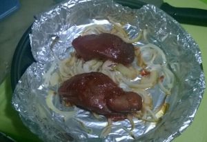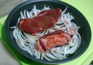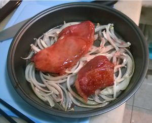 把腌好的叉烧生肉平放在洋葱上,烤箱180度烤30分钟