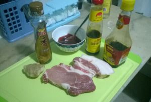 材料全家福,熊猫用的肉是五花肉和自制的叉烧酱,如果懒得自己做酱的朋友可以选择李锦记叉烧酱,这个牌子很坚挺,味道很正宗