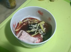加上叉烧酱,鸡粉,盐,蚝油酱油香油和切成丝的姜开始拌,香油和鸡粉可放可不放
