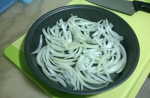 洋葱切粗丝,铺烤盘里