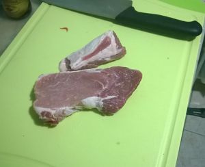 五花肉处理一下,把肥肉和皮切掉,由于切掉了一部分筋,肉被分成了两块