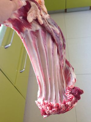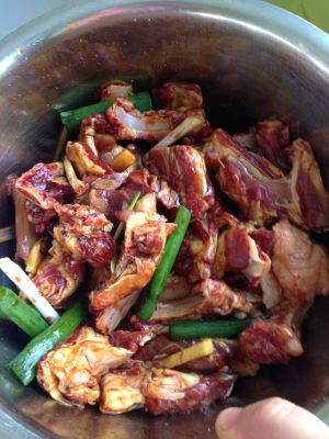 羊排斩成小段,加入葱段,姜片,大料花椒,老抽,生抽,盐。一点点蚝油,腌制两个小时