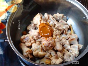 去血腥之后的鸡腿和猪骨,放入生姜、香菇脚、瑶柱等材料;