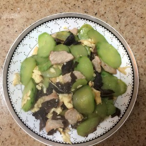 加入黄瓜与黑木耳一起炒,加料酒,不停翻炒至黄瓜片成透明状