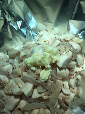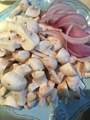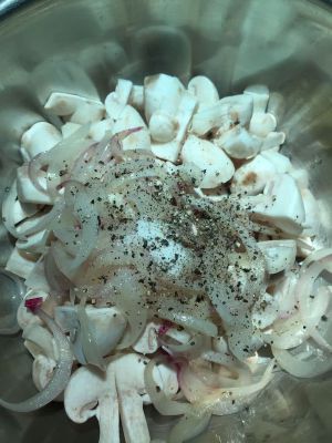 蘑菇、洋葱、盐及适量黑胡椒拌匀