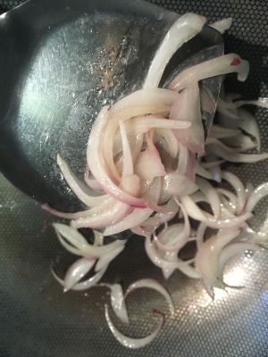 炒锅放10克黄油,加热融化后放入洋葱丝及1克盐,略微翻炒一下