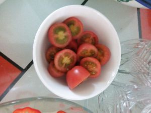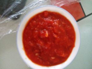 把蒜糜,洋葱碎,入油锅炒香,加入番茄碎,加糖,盐,煮至粘稠。备用。