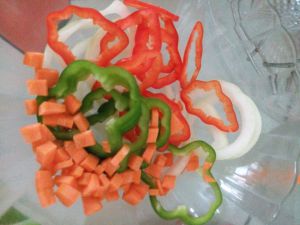 青红椒,洋葱切好,胡萝卜切块。备用。