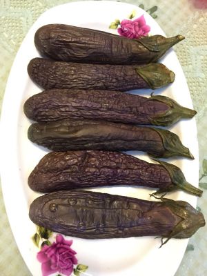 茄子洗干净,在茄子中间划一刀,注意不要切断