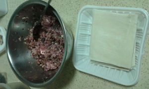 猪肉、木耳,冬菇剁碎,拌上适量的生油,酱油,生粉和盐,使肉入味.