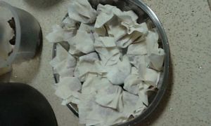 超市购买云吞皮,把肉放在云吞皮中间,手一捏,好吃的云吞就出来啦!如果皮过多的粉不粘的话,可以在皮上弄点水,粘性就回来啦!