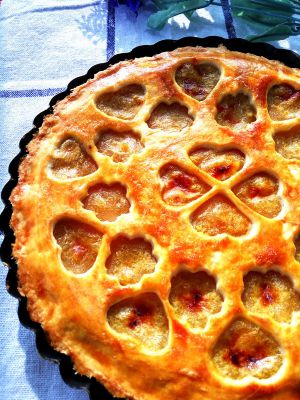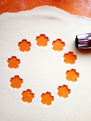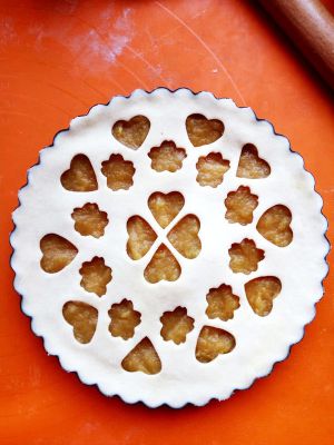 剩余的部分也擀成均匀的薄片,用切水果的模具在饼皮上刻出镂空的图案。至于图案的大小,可以用派盘在面皮上压一下,有个大致的痕迹作为参考