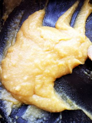制作馅料:苹果去皮,切小丁用料理机打碎成泥后,在不粘锅里小火融化一点儿黄油,加入苹果泥翻炒,加玉米淀粉炒至粘稠,关火晾凉备用