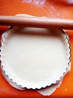 接下来开始做派:面团分成两团。一团擀成薄饼,铺在盘底,用擀面杖沿盘子边缘擀一下,去除多余的部分