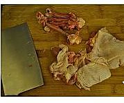 把切好的香菇铺在一个平的盘上,在把腌制好的鸡肉均匀地码在香菇上面,然后在把红枣、枸杞放在鸡肉上面。