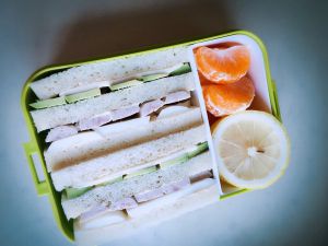 切三角或者对半切都可以,看自己心情啦,^_^蜜桔配在便当里,或者依据喜好配上其他水果。就是一份有滋有味的早餐或者下午茶。