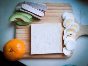 白吐司去边,水煮蛋切片,牛油果切片,香肠切片,任意搭一个色彩鲜艳的水果做搭配,我选的是家里现成的蜜桔^_^