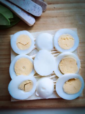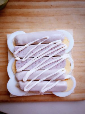 把香肠铺在水煮蛋上,再挤一层蛋黄酱,盖上第二层白吐司