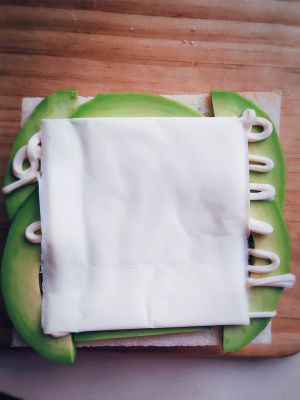 牛油果上挤一层蛋黄酱,然后铺上芝士片,盖上第三片白吐司即可。