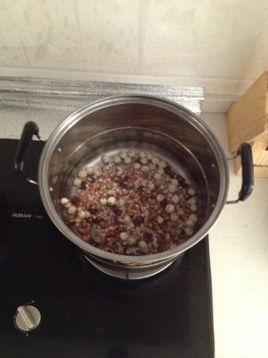 看莲子菱米鸡头米煮的差不多熟的时候,倒入冰糖,继续熬煮,依旧是小火慢煮