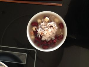 看着粥越来越浓稠,糖分已经化开,小火继续熬煮一会,关火,盖好锅盖闷一下,让每一粒食材都充分吸收下糖分
